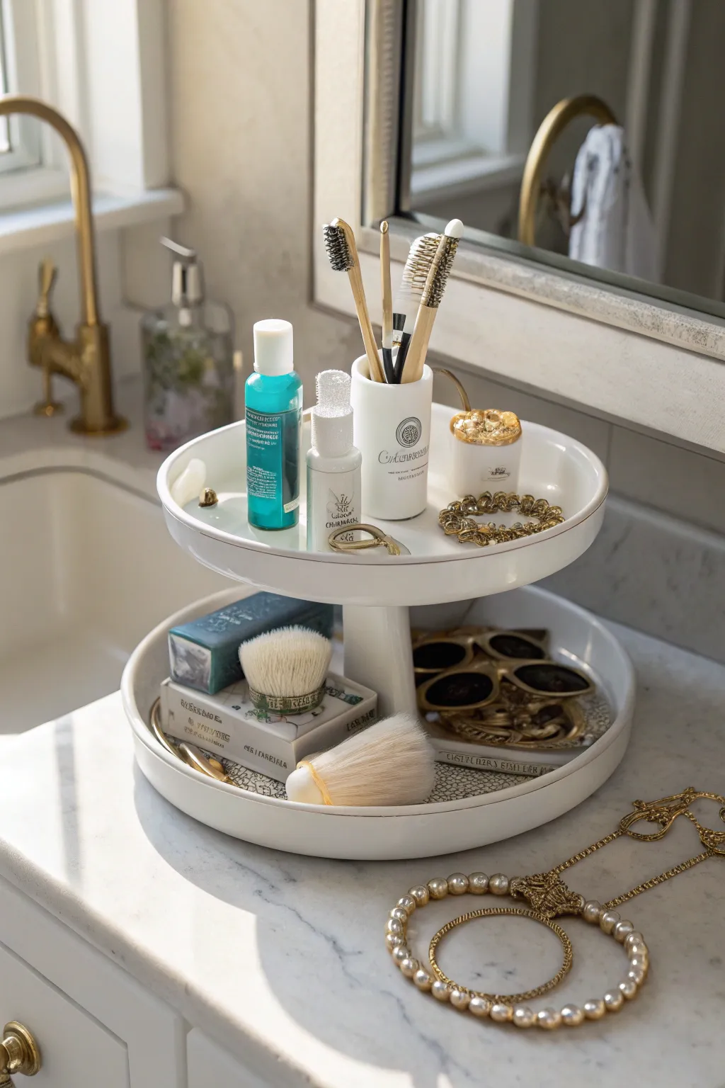 Tiered plates optimally utilize upward space, enabling you to arrange grooming supplies and jewelry. This forms an organized display reminiscent of a boutique setup.