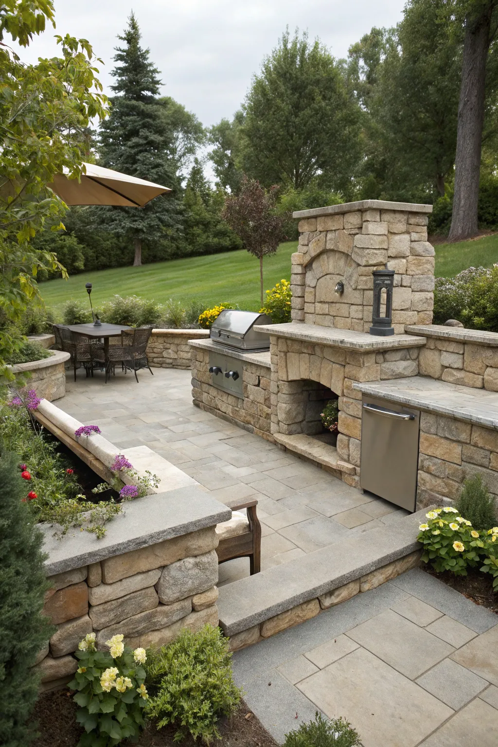 A built-in stone grill harmonizes beautifully with garden walls, creating a seamless aesthetic.