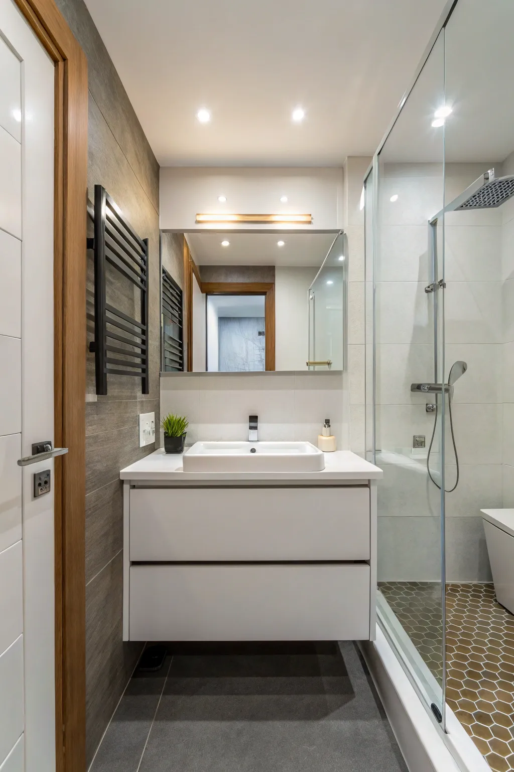 To give the impression of greater space, glass dividers are an outstanding selection. They maintain the bathroom’s openness and permit light to circulate unhindered, a technique I’ve implemented in countless designs.