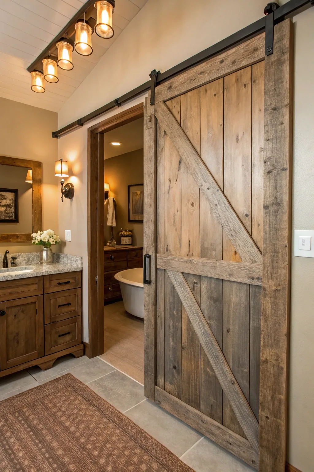 A mobile barn-style door offers space-saving benefits while adding a dash of woodsy appeal. I often suggest these doors in limited spaces to optimize area without compromising design.