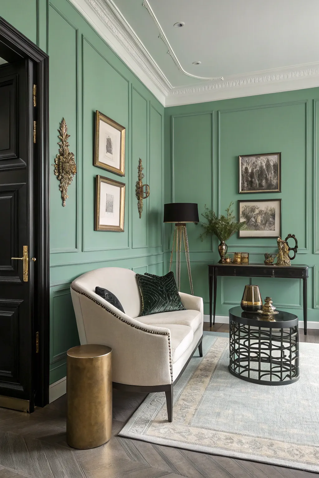 An Art Deco inspired room displaying elegant seafoam verdant walls.