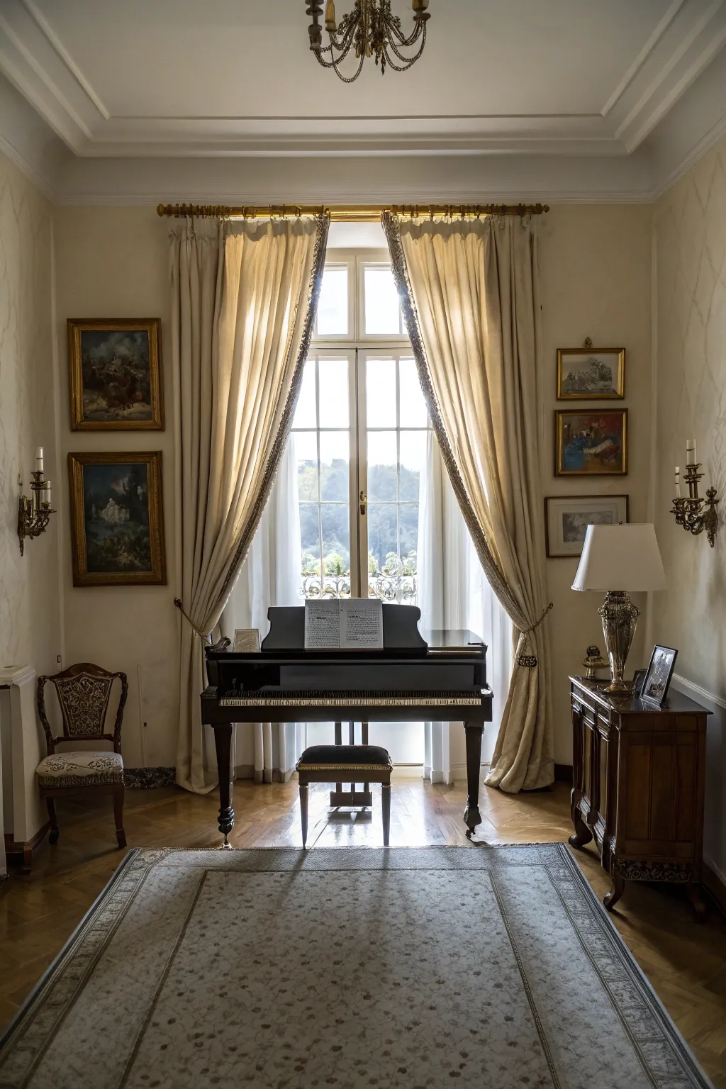 - Detailed Old-fashioned Light Fixture: Enhance ambiance through a detailed, vintage light fixture inside your piano room.