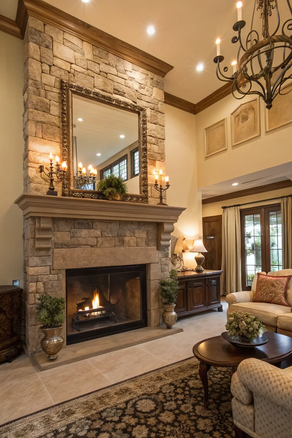 A balanced space featuring a stone fireplace and symmetrical decor enhancing the mantel.