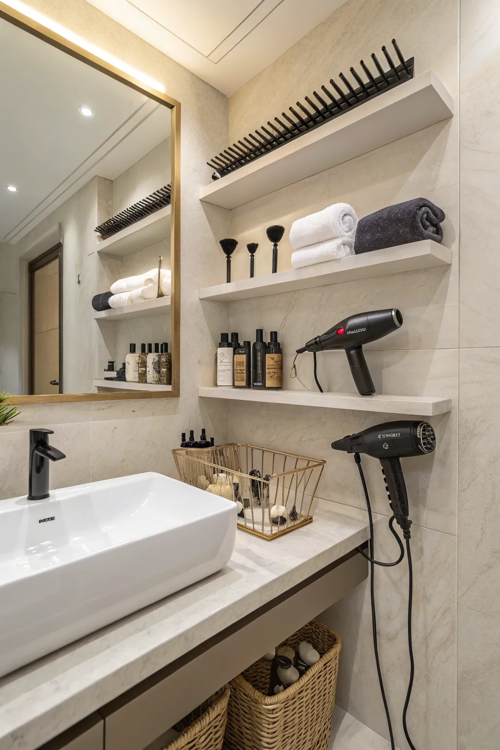 • Contemporary Drifting Wall Platforms: Elevate your bathroom’s aesthetics with streamlined platforms ideally suited for stylishly stowing your hair dryer.