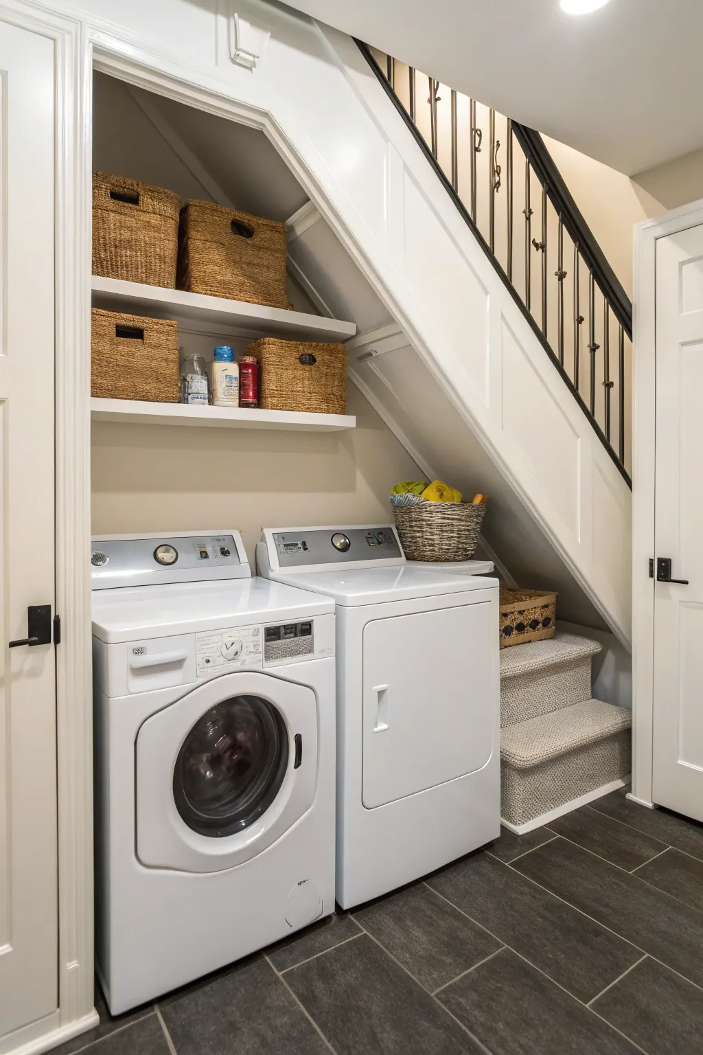 Streamline chores by using a small washing space beneath the stairs.