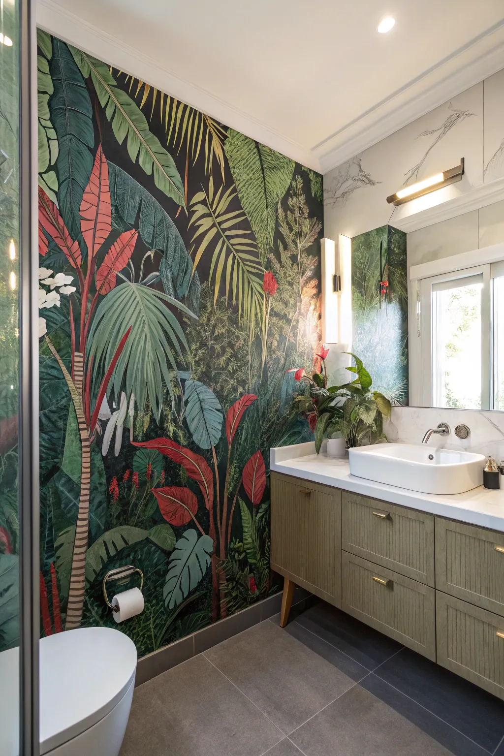 - WildScape Adherent Covering: Easily apply removable jungle wallpaper to create a vibrant, tropical atmosphere in your bathroom.