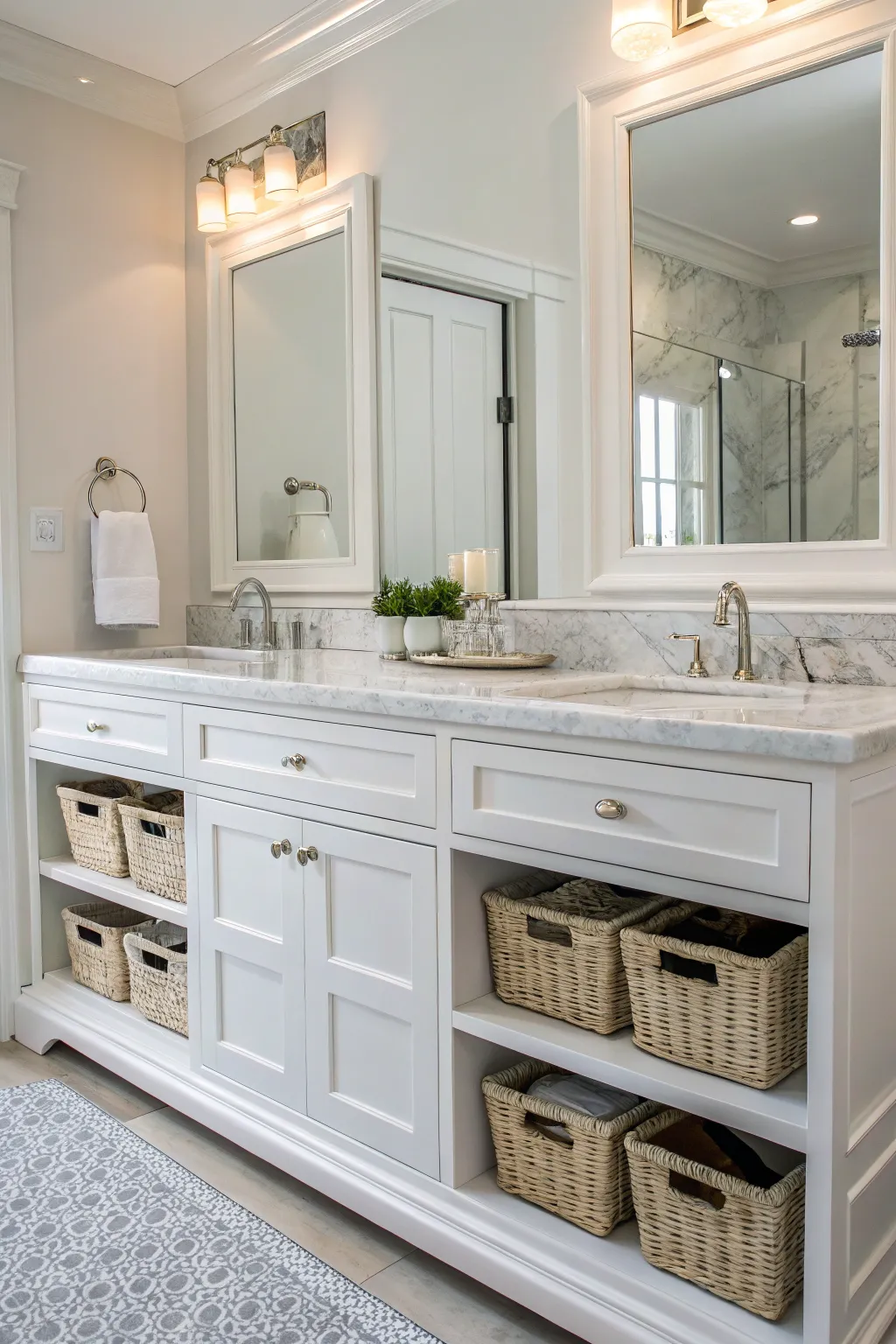 Select white consoles surmounted by marble worktops for a sense of unparalleled luxury. This pairing is not solely gorgeous but incredibly serviceable within a bustling bathroom setting.