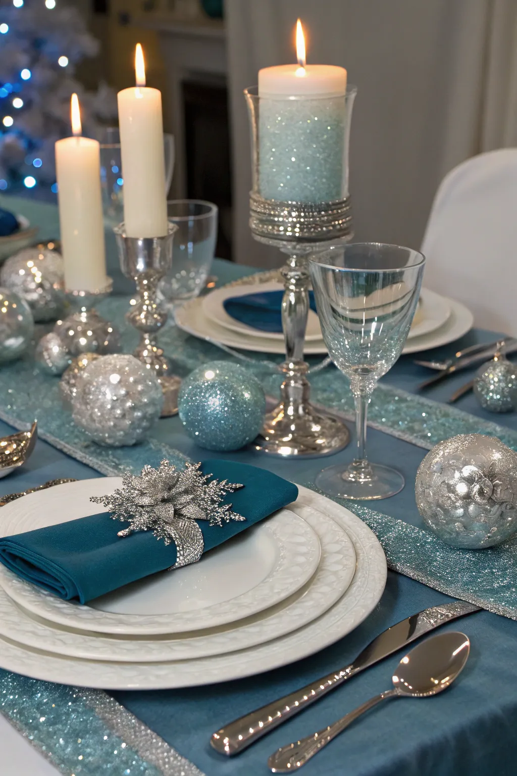 For table placements, employ silver and azure accents with considerable sparkle. Visitors are consistently impressed with the care to detail at each place placement.